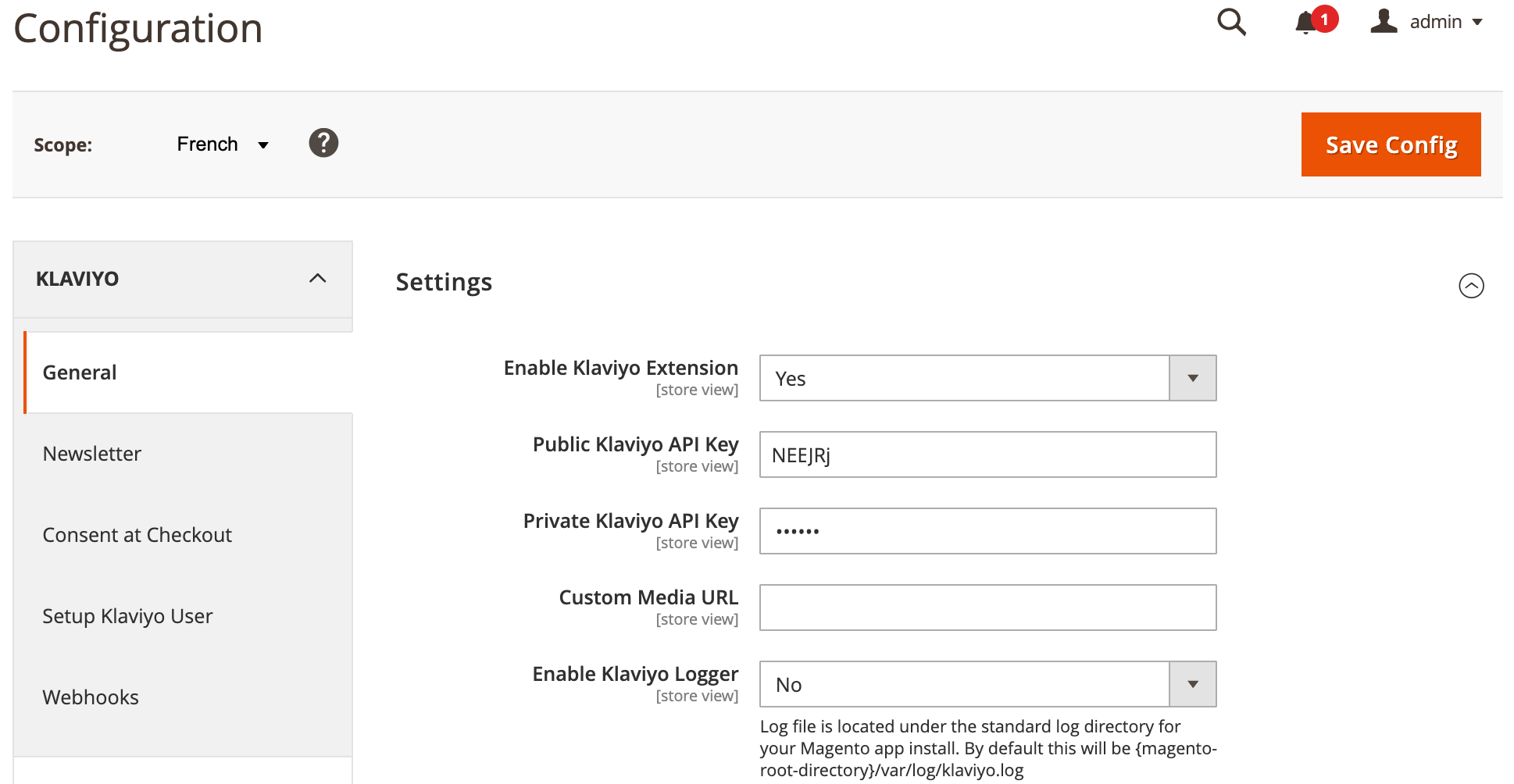 Wenn du die Klaviyo Magento Extension installierst, kannst du sie für einen bestimmten Konfigurationsbereich aktivieren. Wenn du unsere Erweiterung auf Site-by-Site-Ebene konfigurieren möchtest, musst du nur den Geltungsbereich verschieben und den richtigen Klaviyo API-Schlüssel für jede Ansicht einstellen. Achte darauf, dass du diese API-Schlüssel sowohl auf der Ebene der Website als auch auf der Ebene der Ladenansicht einstellst.