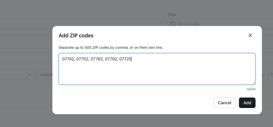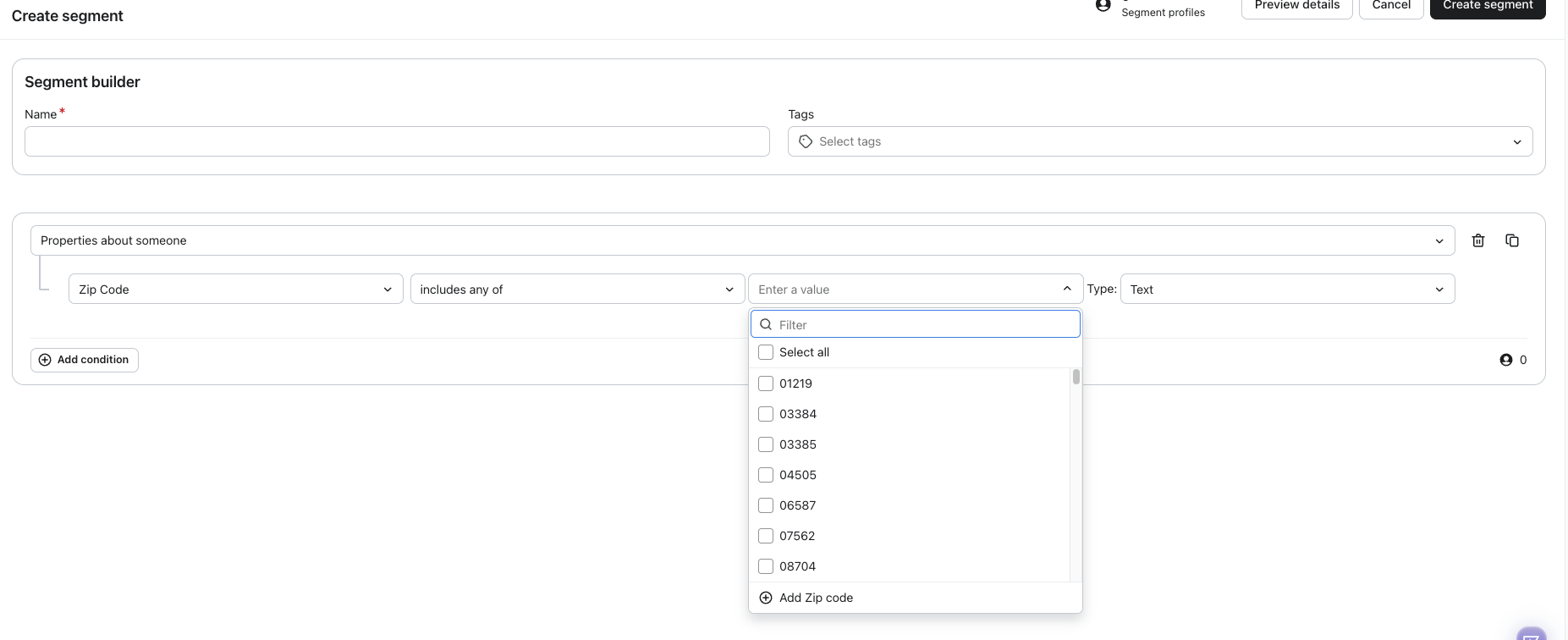 Wenn du Postleitzahl auswählst, wird im Segment-Builder standardmäßig der Operator „enthält eine beliebige von“ verwendet, der die Auswahl mehrerer Postleitzahlen unterstützt. Du kannst bis zu 500 Postleitzahlen aus dem Drop-down-Menü auswählen und auf „Postleitzahl hinzufügen„ klicken, um bis zu 500 Postleitzahlen gleichzeitig hinzuzufügen.