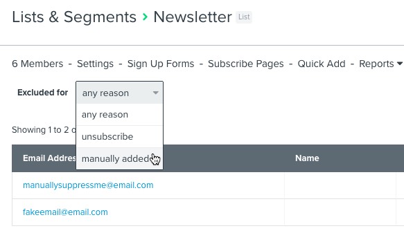 - Wenn jemand global unterdrückt wird und sich erneut bei einer Liste anmeldet, von der er sich zuvor abgemeldet hat, wird er erneut zu dieser Liste hinzugefügt.