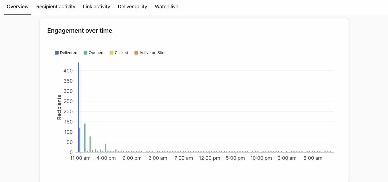 Die Kerndaten zu Öffnungen und Klicks im Block Kundenengagement im Laufe der Zeit stellen einmalige Öffnungen und Klicks dar - diese Zahlen stimmen mit den Zahlen überein, die du auf der Startseite der Registerkarte Kampagne siehst. Eindeutige Öffnungen und Klicks spiegeln die Anzahl der eindeutigen Empfänger wider, die deine Nachricht geöffnet oder angeklickt haben.