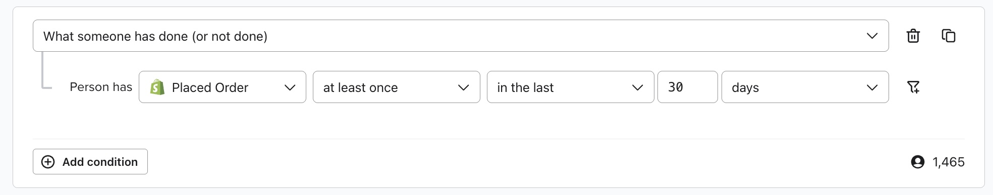 Außerdem lässt sich aus einem Kaufereignis in Echtzeit nicht immer ein Segment von Personen errechnen, die vor 30 bis 60 Tagen mindestens einmal gekauft haben. Dieses Segment fügt alle 24 Stunden neue Profile hinzu und entfernt alte.