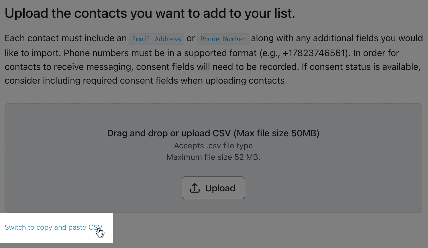 5. Klicke auf Umschalten zum Kopieren und Einfügen von CSV unterhalb der linken unteren Ecke des Upload-Tools.