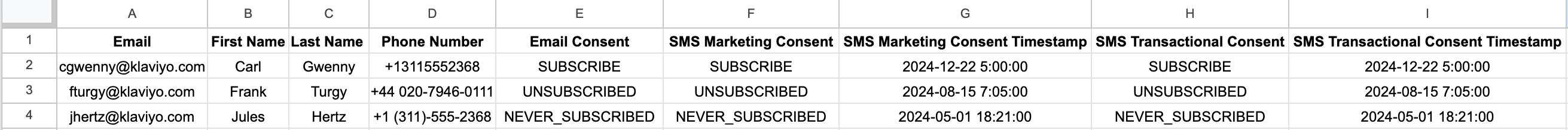 In der Regel sollte die erste Spalte die E-Mail-Adressen deiner Kunde' (entweder mit "Email" oder "Email Adresse) oder Telefonnummern (mit "Phone Number") enthalten. Wenn du SMS Abonnent importierst, empfehlen wir dir, unseren Leitfaden zum Hochladen von SMS-Einwilligung durchzulesen.