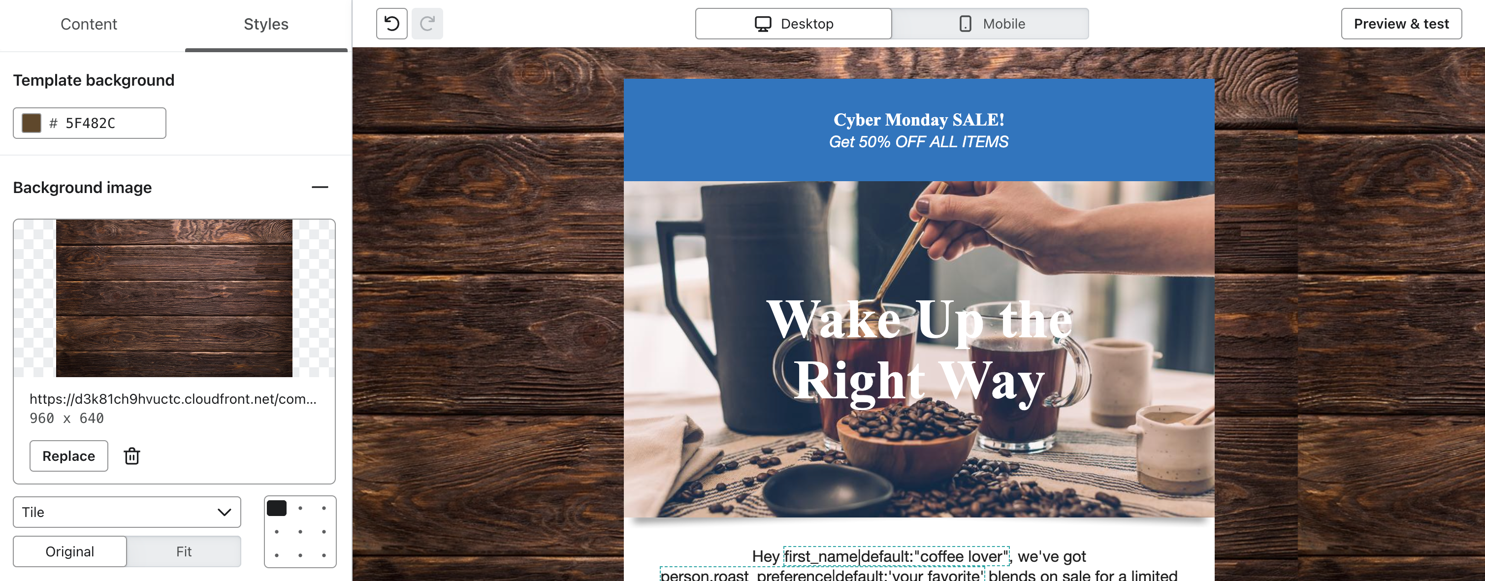 Die Hintergründe der Abschnitte sind jedoch auf bestimmte Bereiche der E-Mail beschränkt. Sie ermöglichen es dir, dynamische, auffällige Bilder und Call-To-Action zu erstellen. Du kannst auch mehrere Call-To-Action über ein Bild einfügen (z.B. "Schuhe kaufen" und "Accessoires kaufen"). Diese abschnittsspezifischen Hintergrundbilder können über die Registerkarte " Stile" eines Abschnitts hinzugefügt werden.