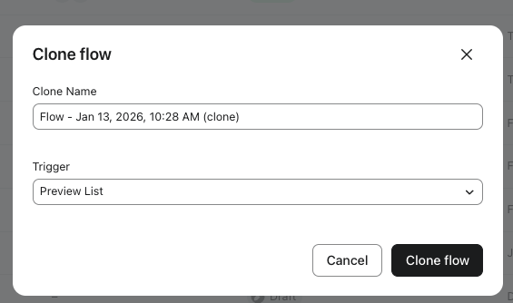 Nachdem du auf Klonen geklickt hast, aktualisiere den Namen und ändere optional den Flow-Auslöser.
