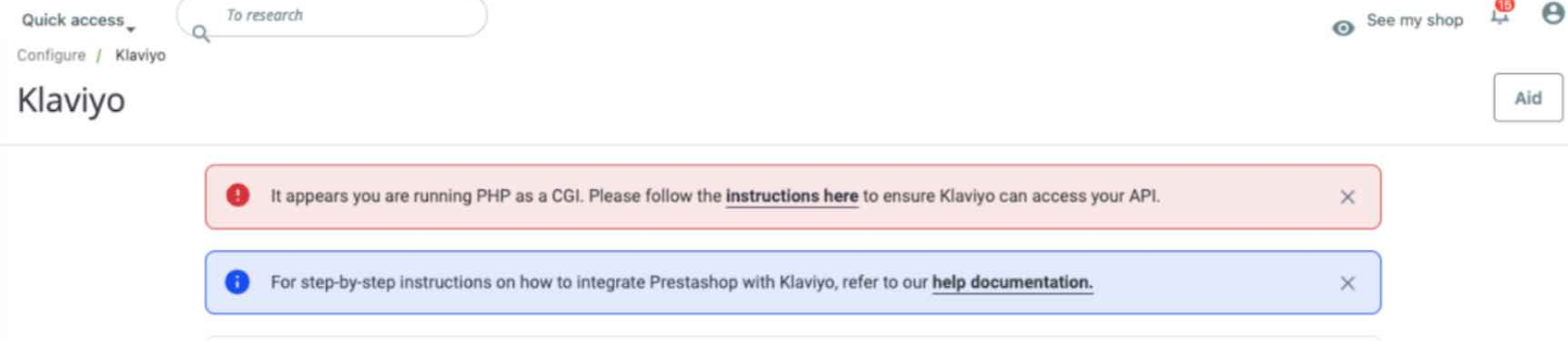 Erfahre, wie du den Autorisierungsfehler „It appears you are running PHP as a CGI“ (Es scheint, dass PHP als CGI ausgeführt wird) löst, wenn du das Klaviyo-Modul in PrestaShop konfigurierst. Um diesen Fehler zu beheben, musst du eine Einstellung in PrestaShop ändern und dann die .htaccess- Datei neu generieren. Gehe wie in diesem Artikel beschrieben vor, um die Integration für PrestaShop ordnungsgemäß abzuschließen.