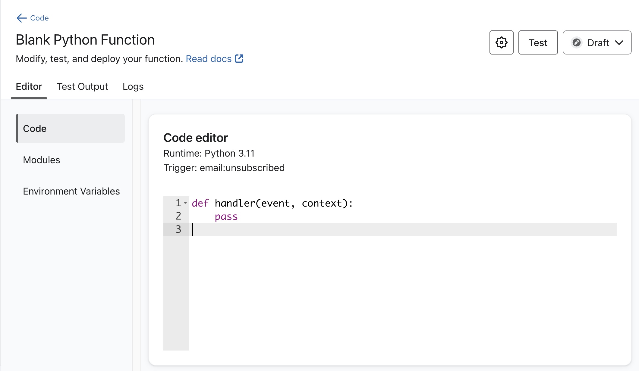 Der Python-Code für diese Lösung wird im Code-Editor geschrieben und wird direkt von Klaviyo ausgeführt.