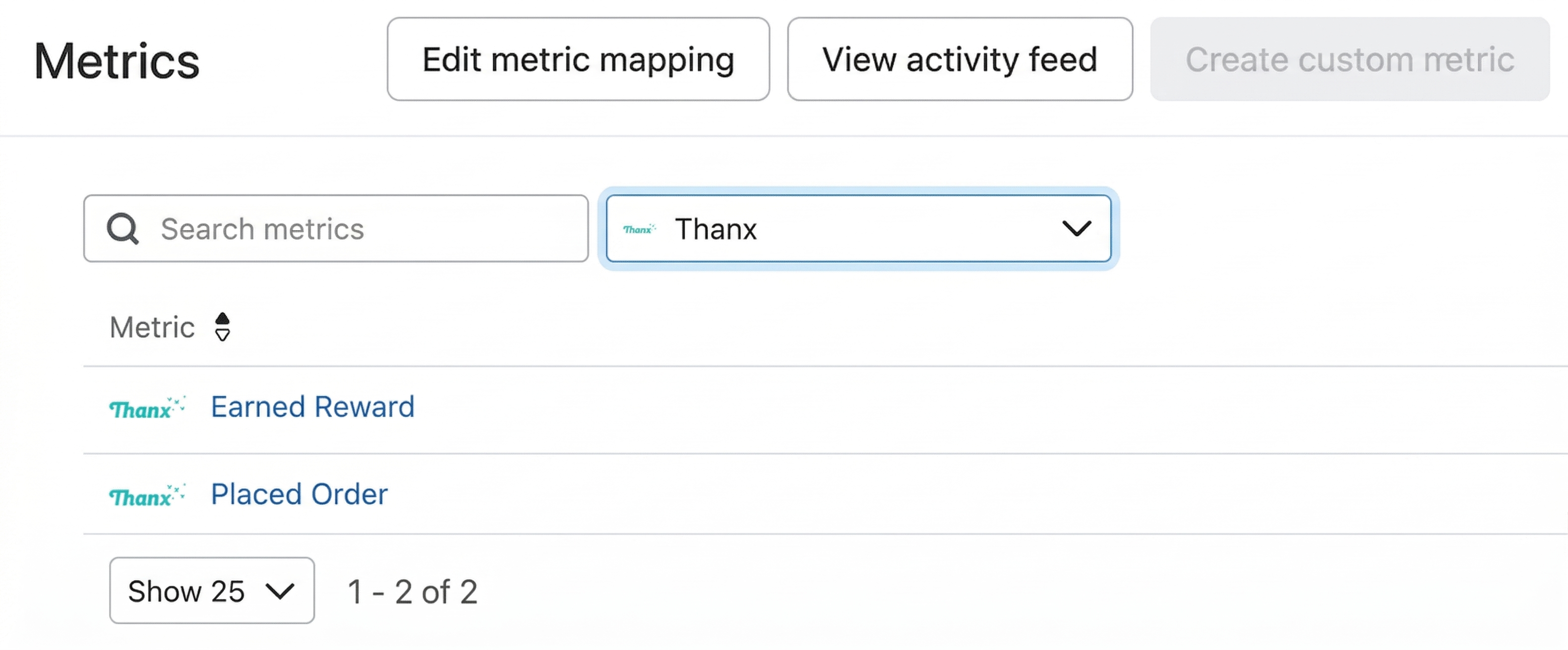 - Wähle Metrik. Hier kannst du alle Metriks in deinem Konto einsehen. filtern nach Thanx , um deine Thanx Metrik zu sehen.
