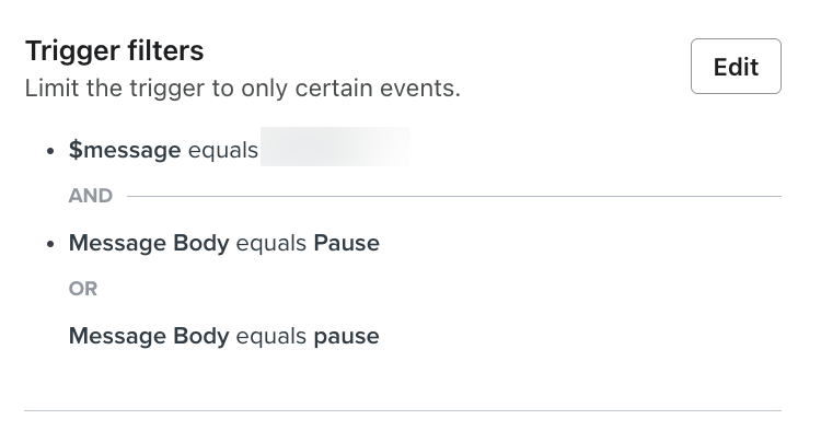 Wir sagen, dass "Pause" das Wort ist, das Abonnent eintippen wird. Jetzt brauchen wir einen Flow, der reagiert und eine Profileigenschaft hinzufügt, wenn ein Abonnent dieses Wort eingibt.