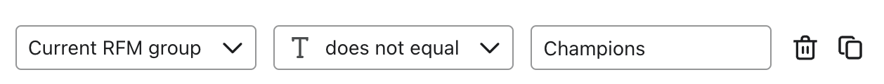 In diesem Beispiel ist die aktuelle RFM-Gruppe die Eigenschaft, auf die sich die Bedingung bezieht, und der Eigenschaftswert ist Champions. Du kannst Champions durch die RFM-Gruppe ersetzen, die du ansprechen willst.