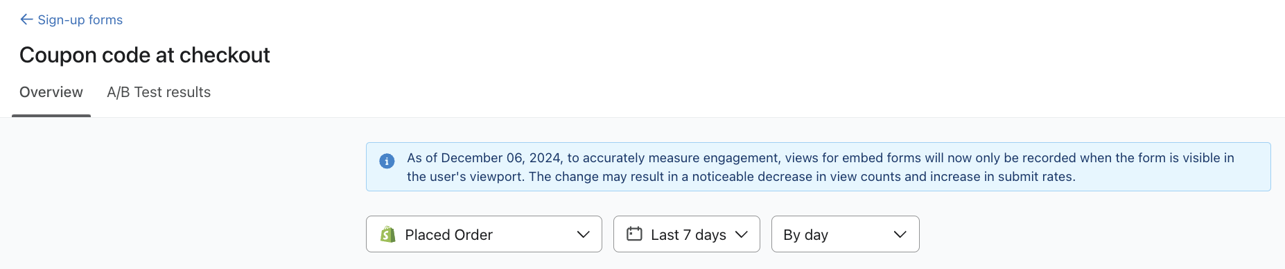 Um die Leistung deines Anmeldeformulars zu verbessern, solltest du A/B-Tests mit verschiedenen Elementen (z. B. Gutschein, Bilder usw.) durchführen, um die Auswirkungen auf die Performance-Metrik wie z. B. Submit-Rate und Umsatz zu messen.