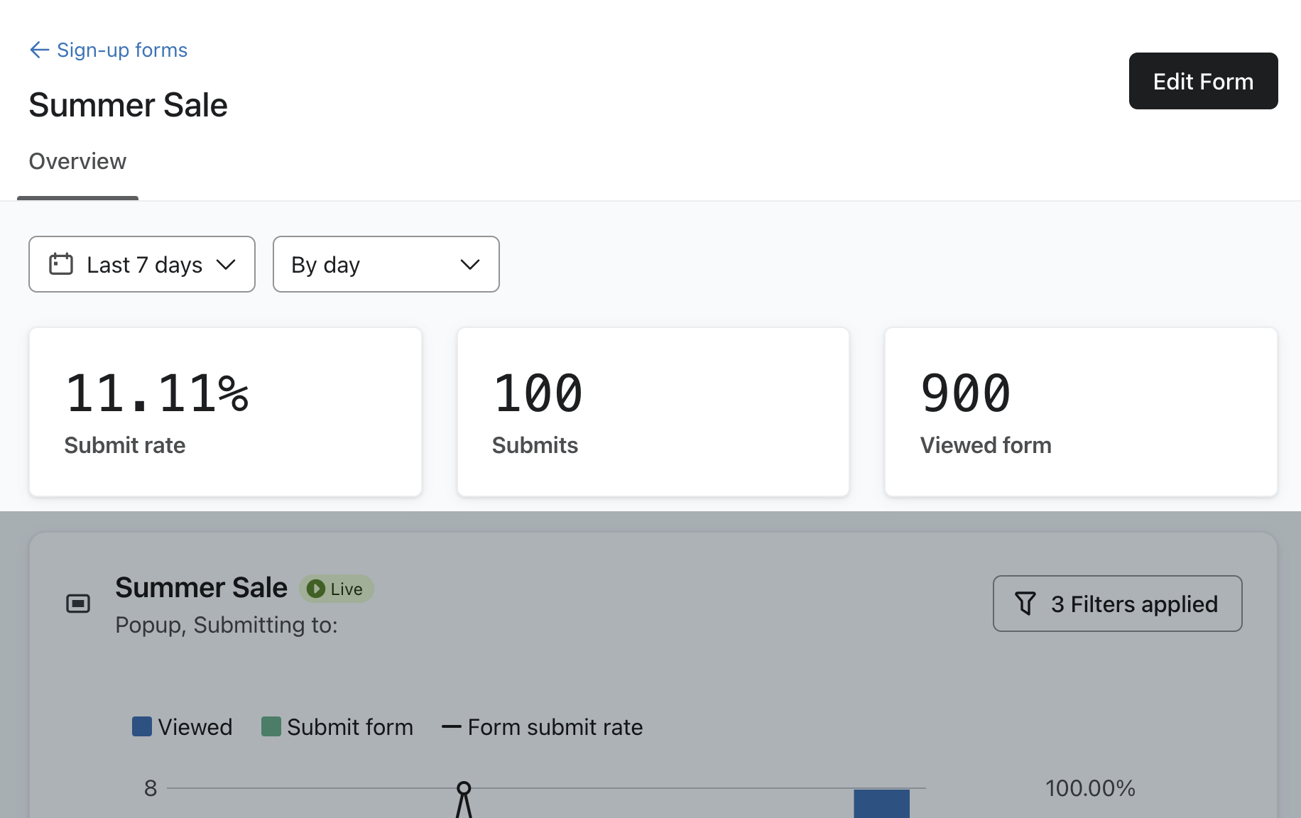 Wenn ein Nutzer mit deinem Formular interagiert und auf die Schaltfläche "Zum App-Bildschirm gehen" klickt, erfasst Klaviyo sowohl eine Ansicht als auch eine Übermittlung für das Formular und du kannst diese Gesamtzahlen für das Formular im Bericht Formularübersicht analysieren.