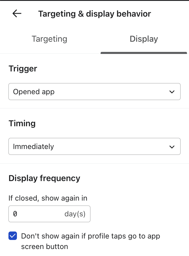 Wir empfehlen außerdem, die Einstellung Nicht mehr anzeigen, wenn auf eine Schaltfläche zum App-Bildschirm geklickt wird zu aktivieren, um zu verhindern, dass das Formular erneut angezeigt wird, nachdem ein Nutzer sich damit beschäftigt hat.