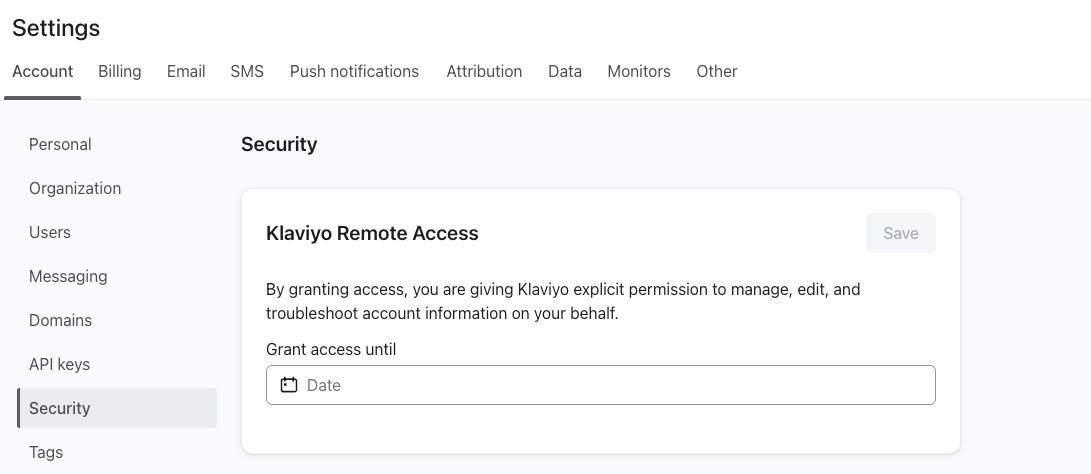 - Wenn du den Chat durchführst, kannst du auf einen Link klicken (http://klaviyo.com/grant-access) die dich zur Registerkarte Sicherheit in Klaviyo führt.