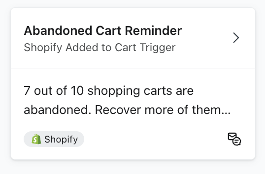 - Wähle eine Warenkorbabbruch-Erinnerung , Shopify Zum Warenkorbabbruchfluss hinzugefügt . Es gibt zwei Optionen: Nur E-Mail, oder E-Mail und SMS.