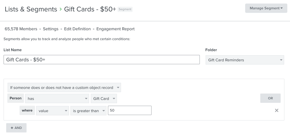 Angenommen, du hast ein benutzerdefiniertes Objekt erstellt, das Geschenkkarteninformationen für deinen Kunden lädt. Mit den Daten aus deinen benutzerdefinierten Objekten kannst du ein Segment erstellen, das alle Profile mit einer oder mehreren Geschenkkarten im Wert von weniger als 50$ oder mehr enthält.
