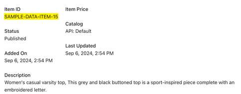 Um eine Vorschau aller verfügbaren Details zu einem Artikel zu erhalten - einschließlich aller Metadaten - füge das folgende Snippet zu einem Textblock in einer Testvorlage hinzu und aktualisiere itemID mit der Produkt-ID eines der aktuellen Produkte in deinem Katalog.