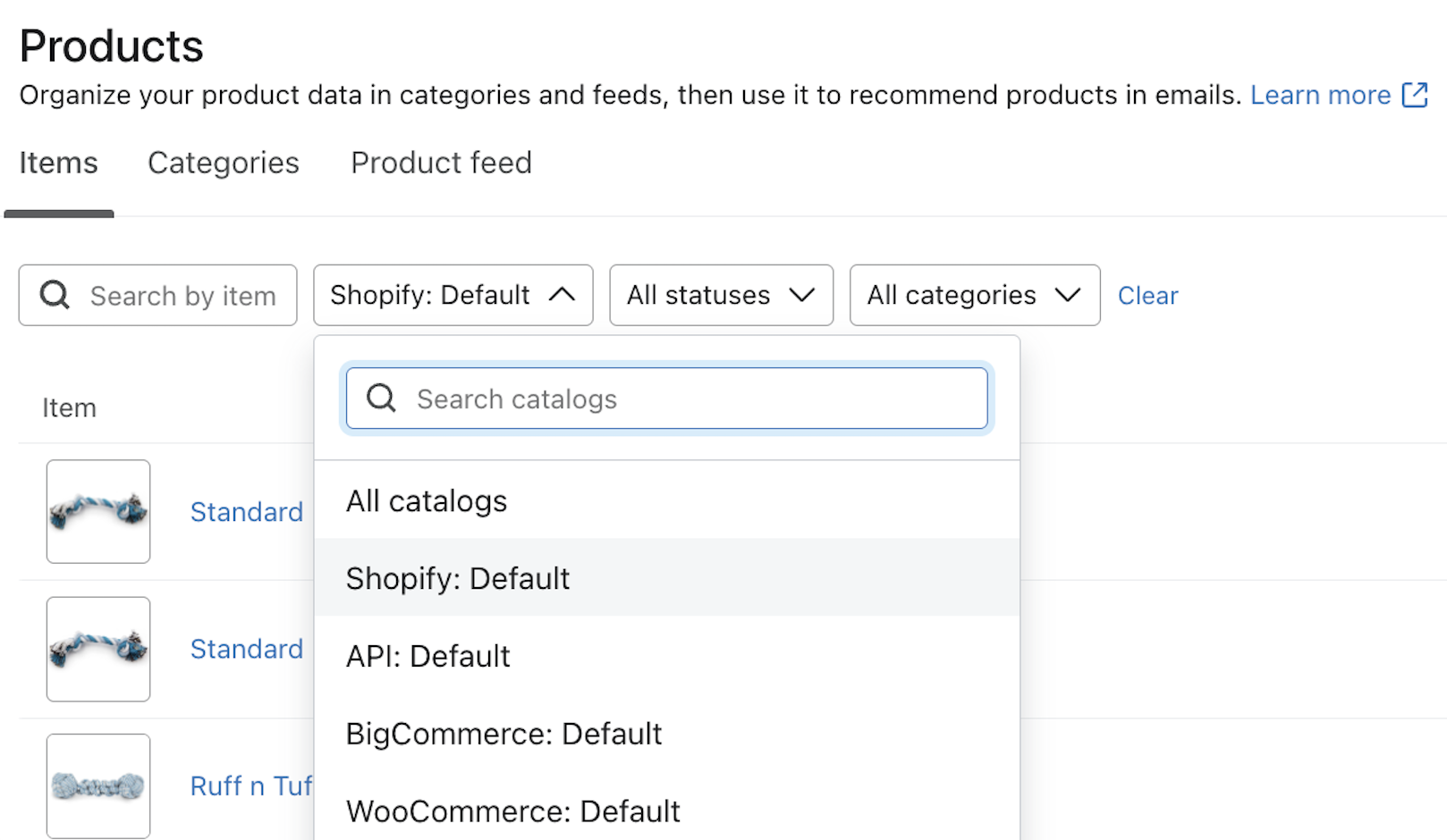 Lerne, wie du das Katalog-Tag verwendest, mit dem du in deinen E-Mails, SMS und Push-Nachrichten auf bestimmte Produktinformationen aus deinem Katalog verweisen kannst. Das ist nützlich, wenn du benutzerdefinierte Produktempfehlungen oder Querverweise auf Produktinformationen erstellen willst. Wenn du zum Beispiel deine eigene Empfehlungsmaschine verwendest, kannst du deine eigenen Produktempfehlungen als Ereignis- oder Profildaten an Klaviyo übergeben und diese Daten dann in der Vorlage verwenden.