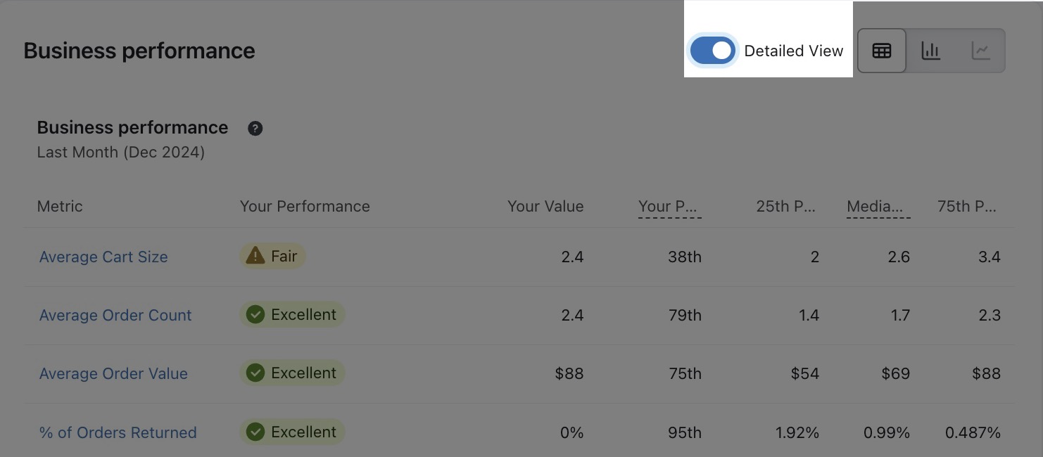 Um zusätzliche Daten für Benchmarks Perzentile aufzudecken, schalte die Option für die Detailansicht oben rechts um.