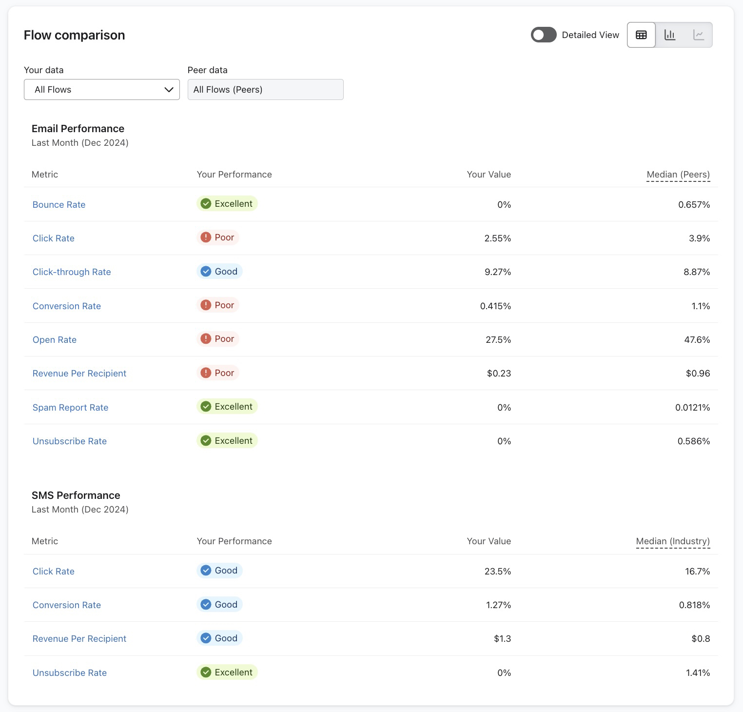 Die Flow-Seite zeigt deine Leistung im Laufe der Zeit und im Verhältnis zu anderen Unternehmen, die deinem Unternehmen ähnlich sind (d.h. die Vergleichsgruppe). Auf dieser Seite kannst du dich auf alle Flows, bestimmte Flows oder bestimmte Arten von Flows konzentrieren, wie z.B. eine Welcome-Serie oder Warenkorbabbruch-Flow. So kannst du ihren Erfolg im Laufe der Zeit verfolgen und Bereiche mit Verbesserungspotenzial identifizieren. Du siehst auch eine Aufschlüsselung des E-Mail-Flusses und des SMS-Flusses.