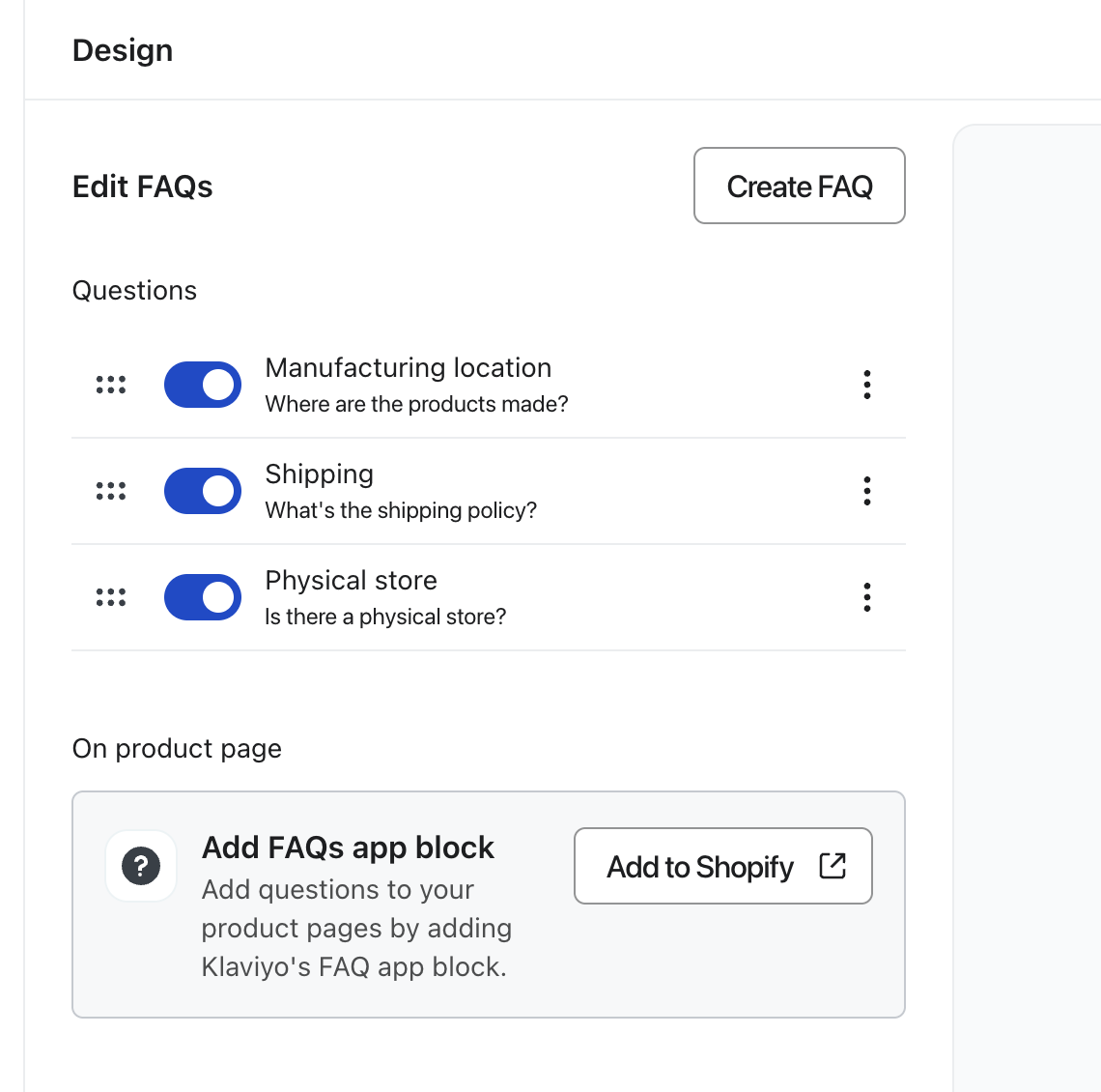 Außerdem kannst du FAQs auf deinen Produktdetailseiten anzeigen. Dazu fügst du den Klaviyo FAQs App-Block zu deinem Shopify Online-Shop hinzu.