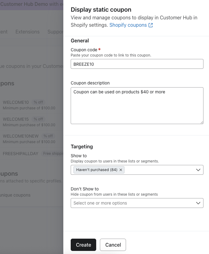 allgemeingültiger Gutschein muss zuerst in Shopify erstellt und dann manuell zu Klaviyo Customer Hub hinzugefügt werden. Du kannst allgemeingültige Gutscheine auf bestimmte Listen oder Segmente ausrichten, wenn du sie hinzufügst.