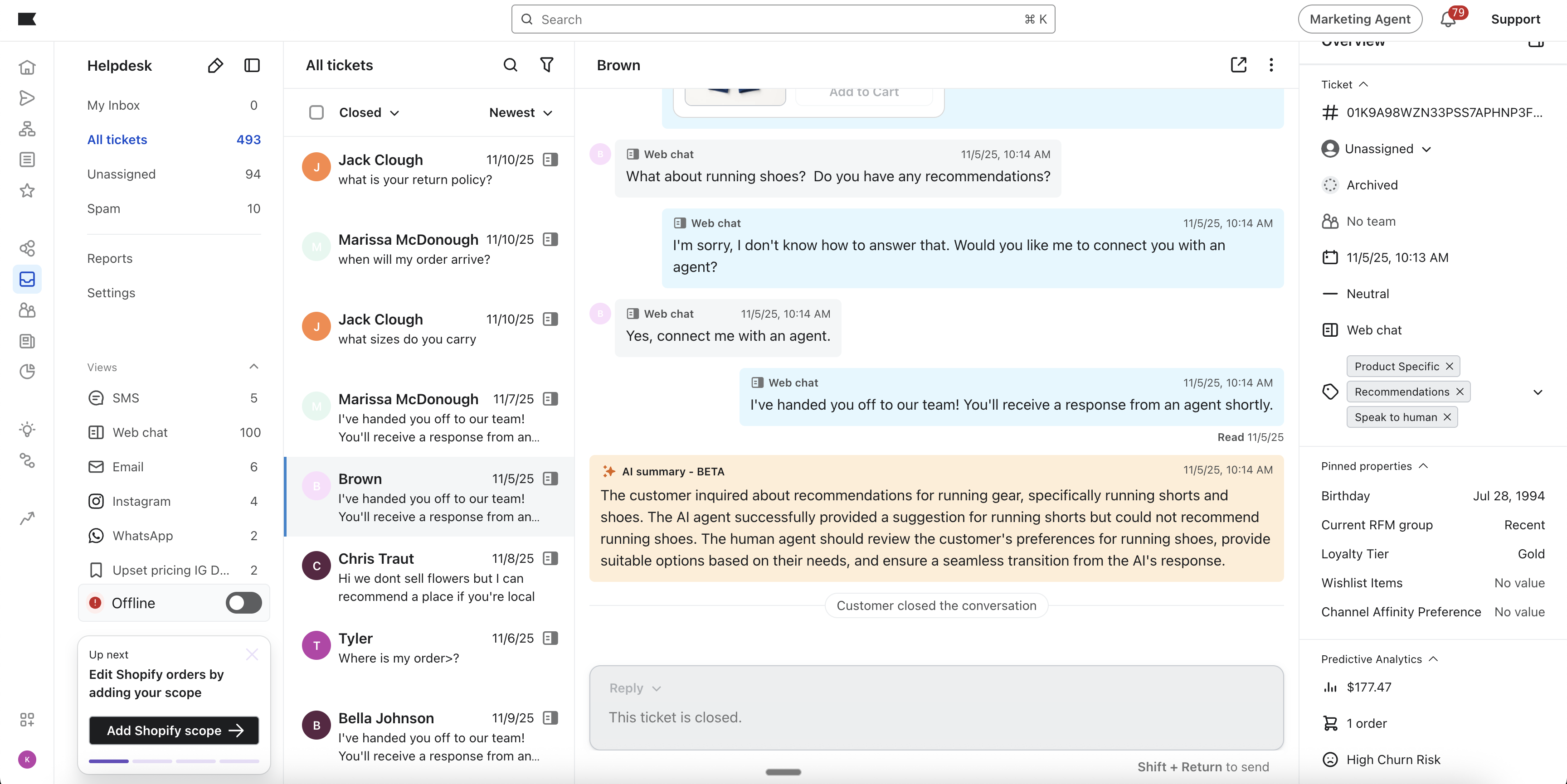 Angeheftete Profileigenschaften sind eine Helpdesk-Einstellung, die Klaviyo mitteilt, welche bis zu fünf Kundeneigenschaften immer in der Seitenleiste des Tickets angezeigt werden sollen. Dieser kurze Überblick macht Kontextwechsel überflüssig und sorgt dafür, dass sich die Agenten auf die Unterhaltung konzentrieren können.