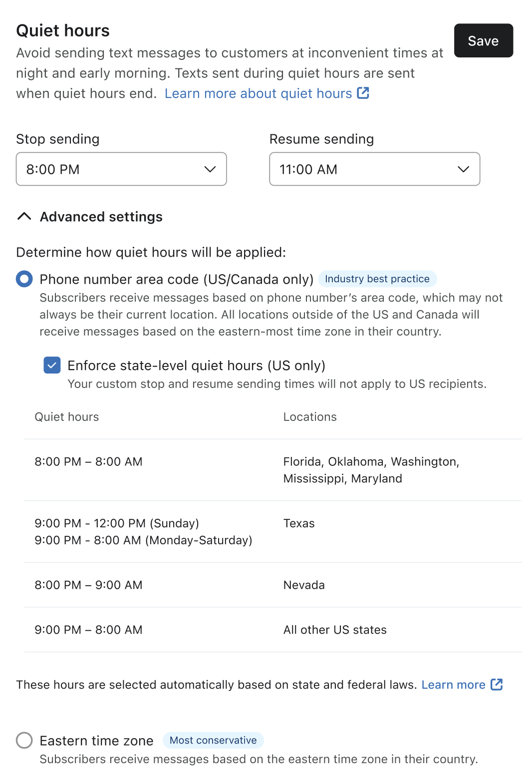 Diese Einstellung basiert auf der Vorwahl des Empfängers für US-amerikanische und kanadische Telefonnummern. Du kannst auch die Ruhezeiten auf Bundesstaatsebene aktivieren (nur USA), um automatisch den bundesstaatlichen Regeln zu folgen. Für Empfänger außerhalb der USA und Kanadas verwendet Klaviyo stattdessen die östliche Zeitzone in ihrem Land. -