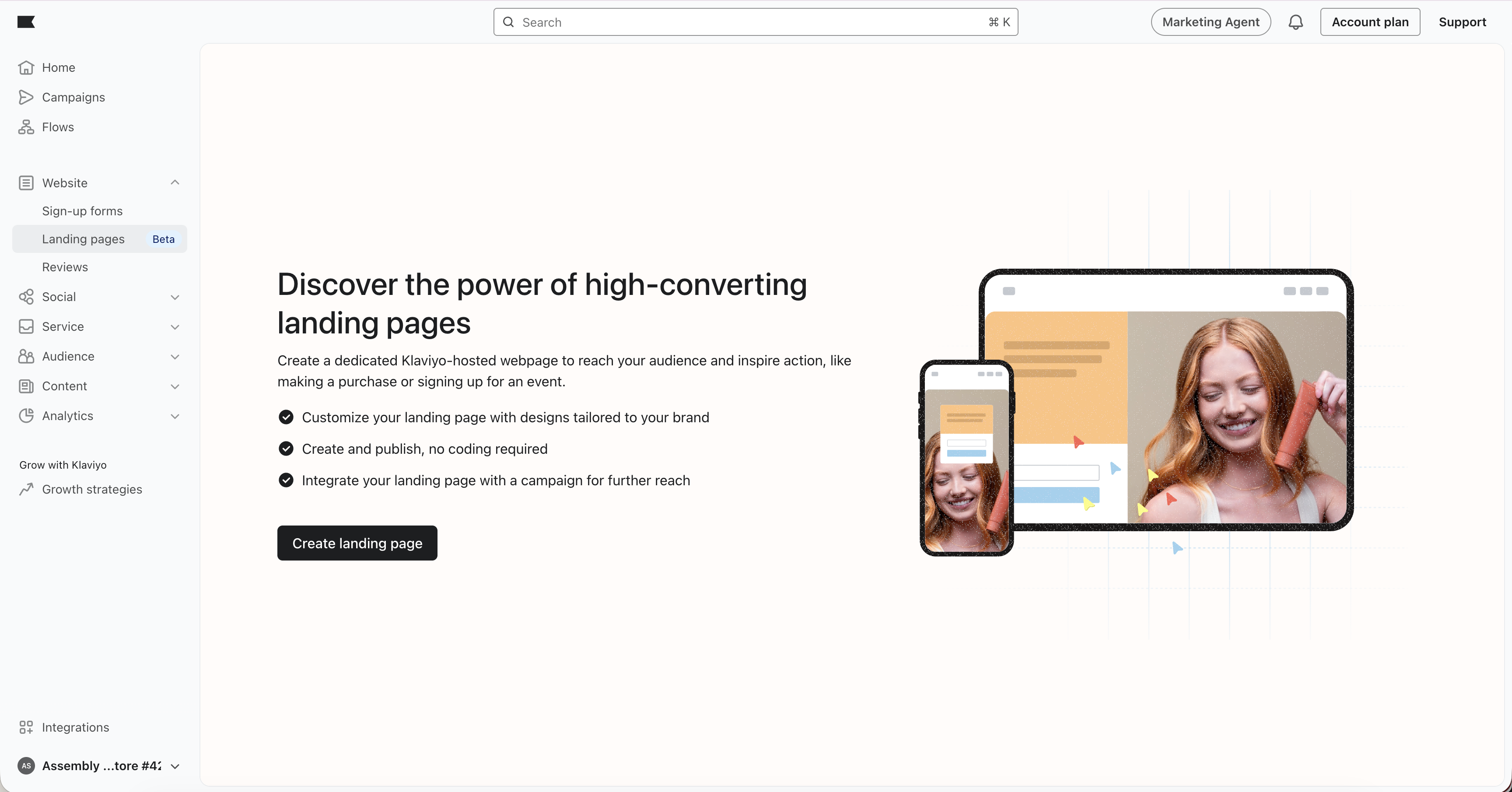 Erfahre, wie du in Klaviyo Kampagnen erstellst und anpasst, damit du eine dedizierte, gehostete Landingpage in deinen Kampagnen teilen, E-Mail- und Telefonnummern-Abonnenten erfassen und die Performance messen kannst.