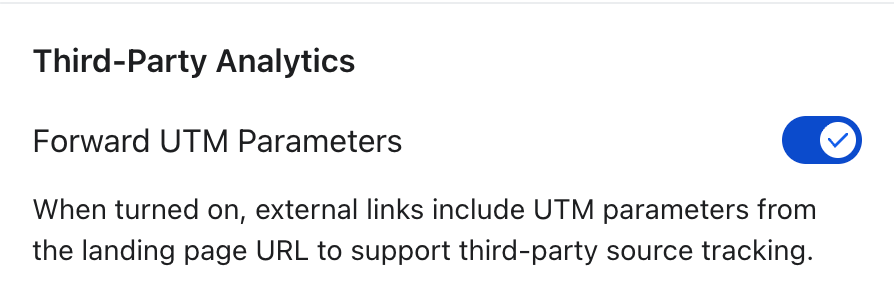 Wenn du nicht möchtest, dass UTM automatisch an deine Website weitergeleitet wird, deaktiviere die UTM-Weiterleitungseinstellungen in deinen Landingpage-Einstellungen. Wenn diese Einstellung deaktiviert ist, fügt Klaviyo keine UTM-Parameter an deine Schaltflächen-URLs an, es sei denn, du fügst sie selbst hinzu.