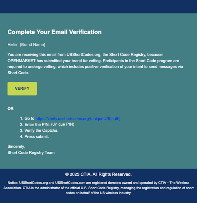 Alle Marken, die Nachrichten mit US-Kurzwahlnummern versenden, müssen die jährliche Markenüberprüfung über das US-Kurzwahlnummern-Register abschließen. Dies ist eine obligatorische CTIA-Compliance-Anforderung und gilt für alle aktiven und ausstehenden US-Kurzwahlnummern.