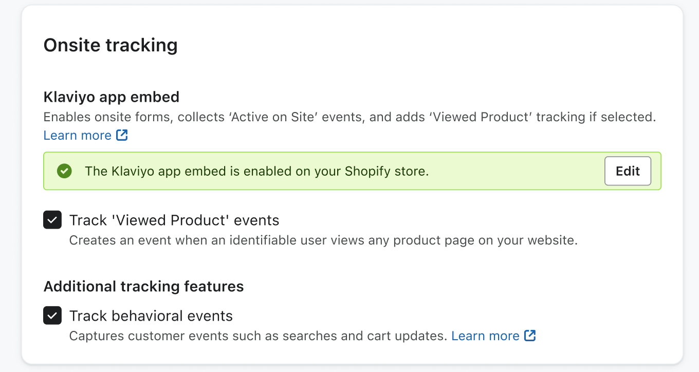 Vielleicht möchtest du das Onsite-Tracking aus Gründen der Website-Geschwindigkeit entfernen, obwohl Klaviyo.js kürzlich aktualisiert wurde, um die Auswirkungen in dieser Hinsicht zu minimieren. Beachte, dass die Einbettung der Shopify-App von Klaviyo den nativen Tag-Manager der Website umgeht und dazu führen kann, dass das JavaScript von Klaviyo schneller geladen wird. Außerdem verfolgen wir einige Ereignisse über einen Shopify Server Pixel(Kollektion angesehen, Suche abgeschlossen und In den Warenkorb gelegt).