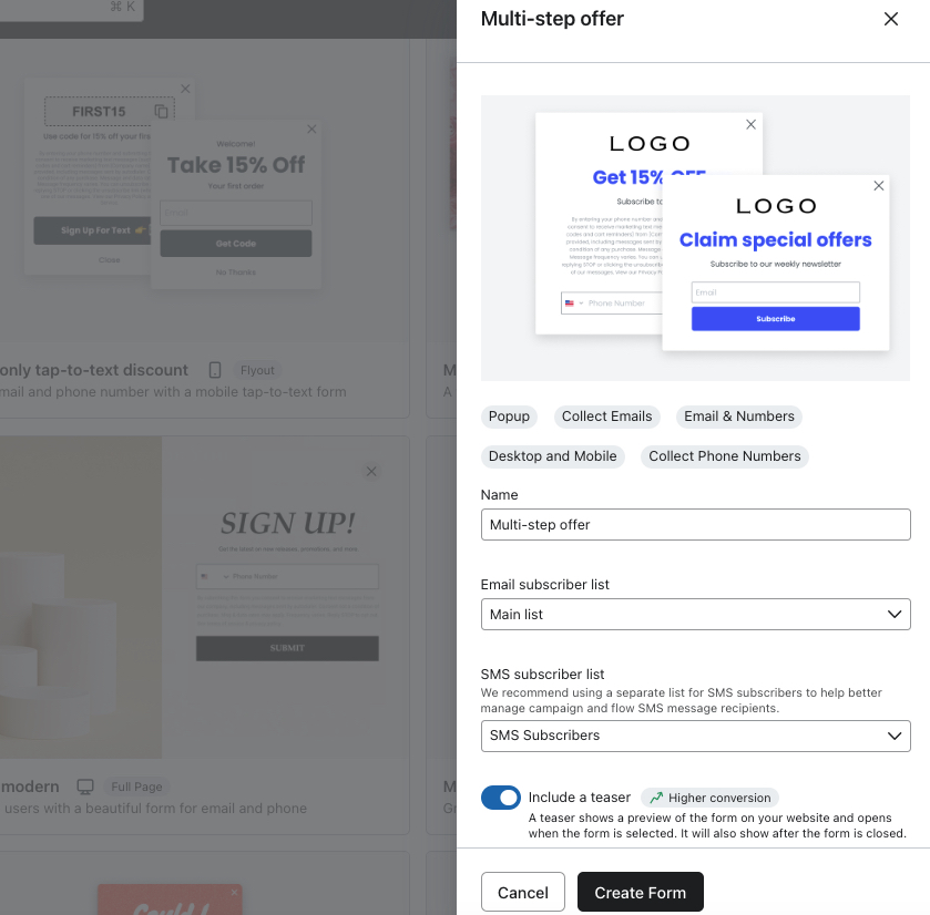 - Hier haben wir ein Formular namens "Mehrstufiges Angebot" gewählt. Beachte, dass alle Vorlagen in unserer Formularbibliothek, die E-Mail- und Telefonnummern erfassen, über mehrere Schritte verteilt sind ( Klaviyo ).