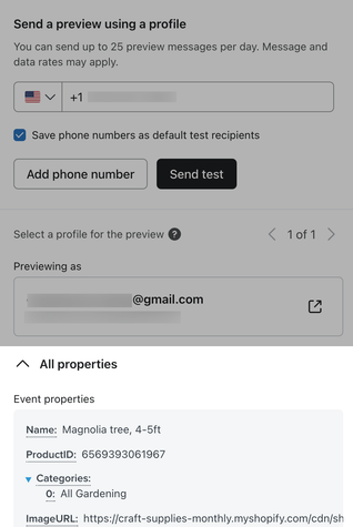 2. To find event variables, click Preview & test. This modal shows the 10 most recent events that you can navigate between (e.g., for a post-purchase flow, the 10 most recent Placed Order events will show here).