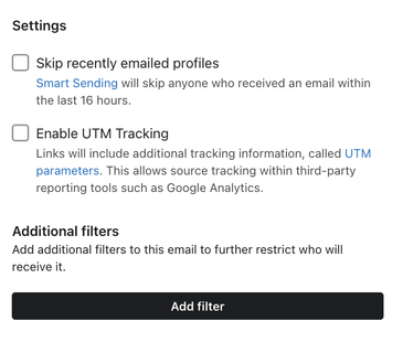Decide whether you would like to turn on UTM Tracking for a particular email. - Additional filters