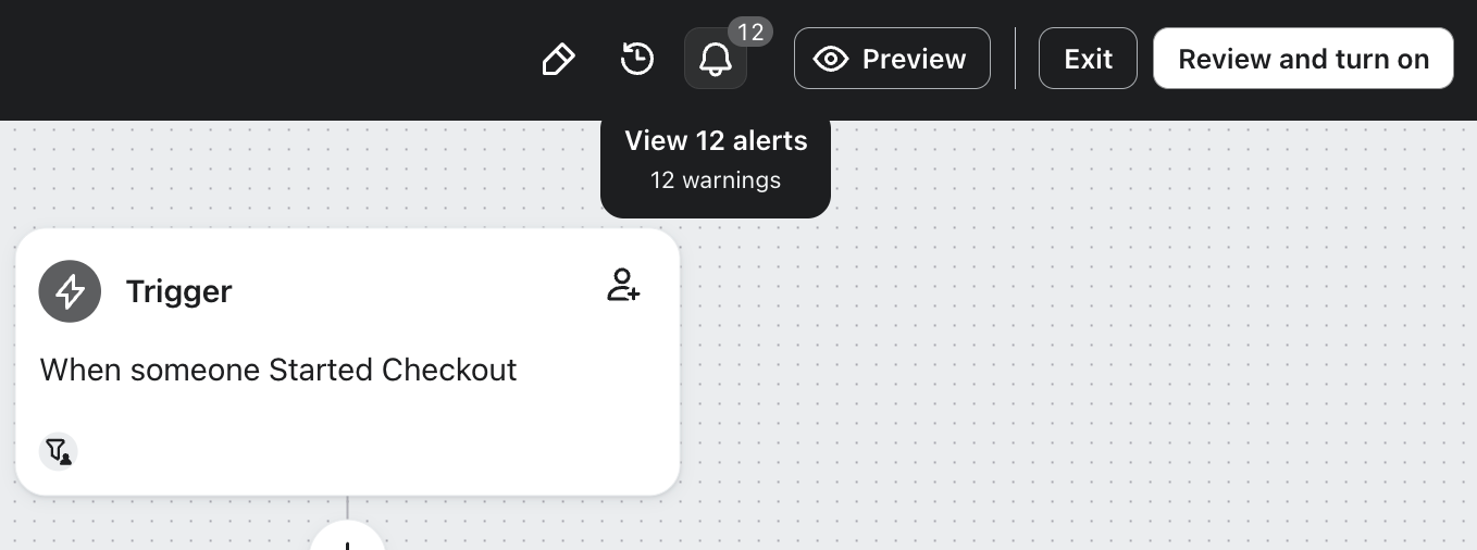 For alerts in the flow builder, click on the Alerts icon button on the right side of the header bar to view a list of issues with flow components.