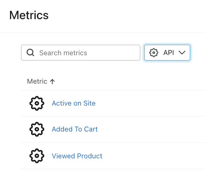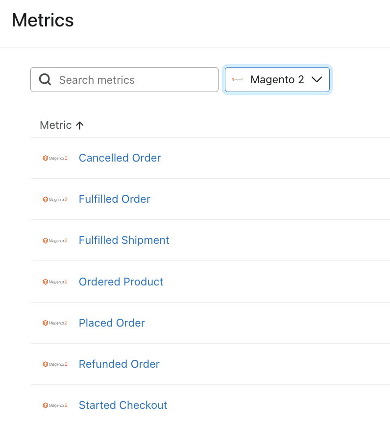 In Klaviyo, you can navigate to your account's Analytics tab in the left sidebar to view all of the metrics in your account; the metrics with a Magento 2 icon are the order events synced from your Magento 2 integration. You will also see Klaviyo onsite tracking events with a gear icon; these are also tracked through the integration.