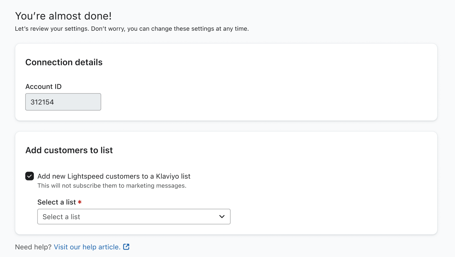 - Choose whether or not you'd like to add new Lightspeed customers to a Klaviyo list, then select a list from the dropdown.