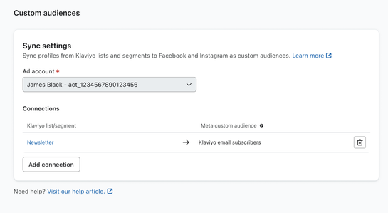 - Click Add connection, then select a Klaviyo list/segment and a Meta custom audience to connect. The syncs you create must be one-to-one between Klaviyo lists or segments and Meta custom audiences.