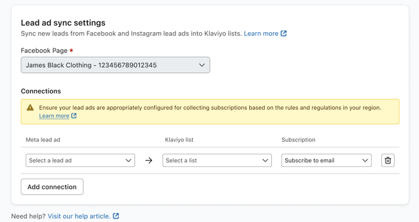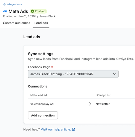 Want to learn more about collecting subscribers via lead ads, including how to edit existing connections? Check out our article How to sync Meta lead ad subscribers to Klaviyo.