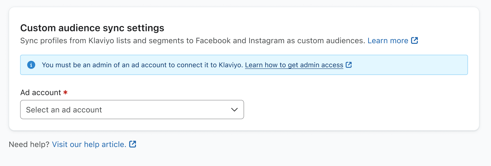 - Back in Klaviyo, you'll be asked what data you want to sync: select custom audiences, lead ads, or both. Then, click Next.