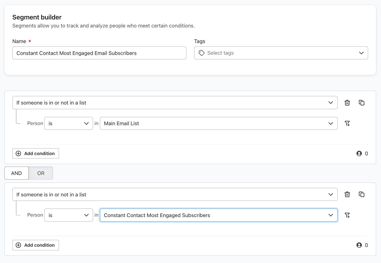 - Create segments in Klaviyo where you include members who are in both your main email list in each engagement tier from Constant Contact. As an example, your Most Engaged email segment in Klaviyo may look like: