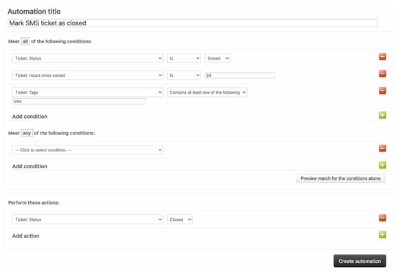 Optional: Create an automation in Zendesk to mark SMS and WhatsApp tickets as "Closed" sooner