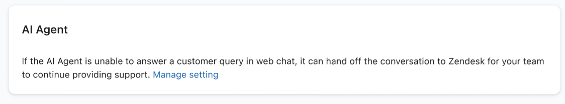 9. If you're using Customer Hub and AI Agent: You can hand off customer queries the AI Service Agent can't answer to your team in Zendesk. Click Manage setting to go to the AI Agent settings and elect Zendesk as your agent handoff.