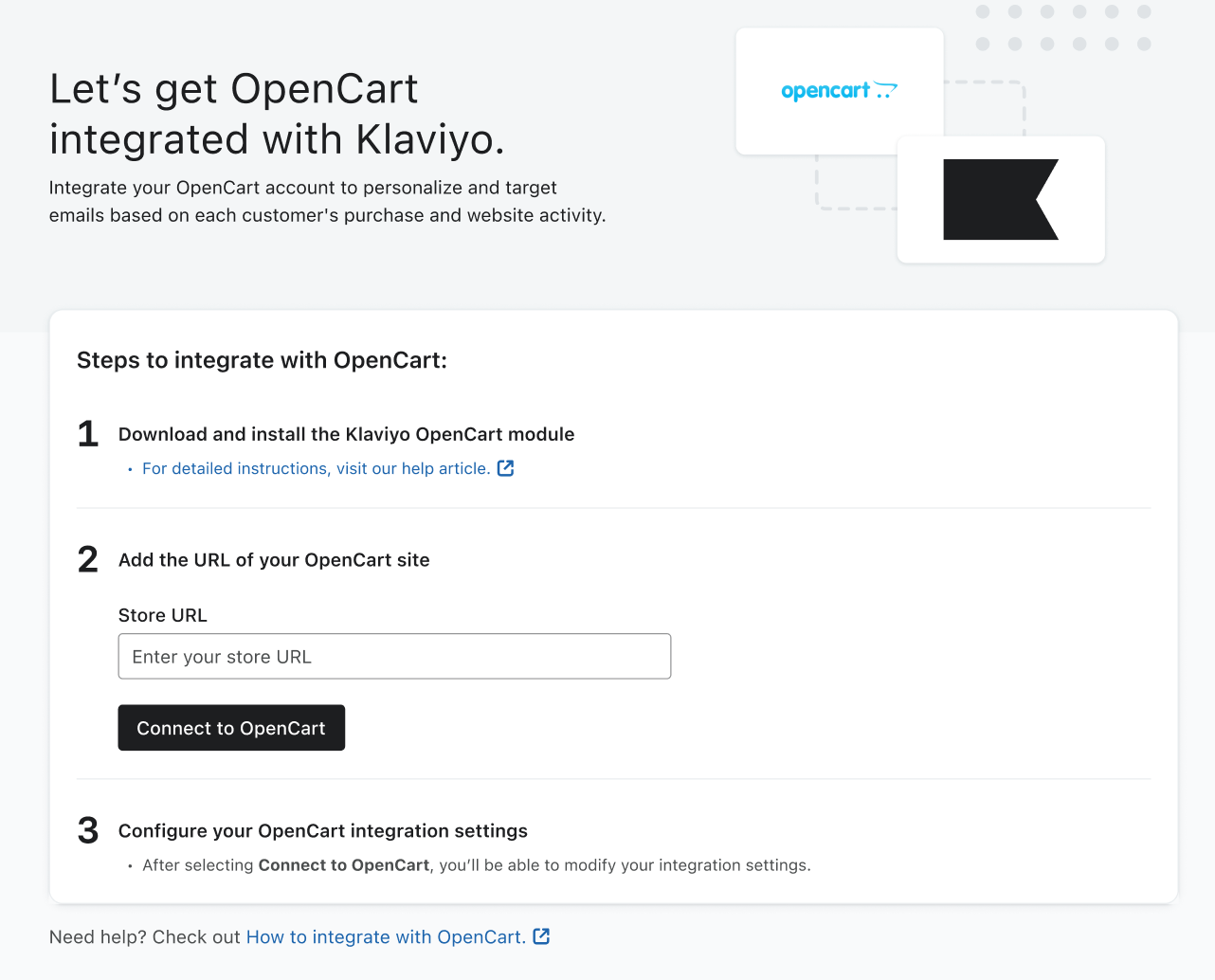 Learn how to integrate OpenCart with Klaviyo. After completing these steps, you'll be able to personalize and target emails based on each customer's purchase and website activity. The OpenCart integration syncs every hour.