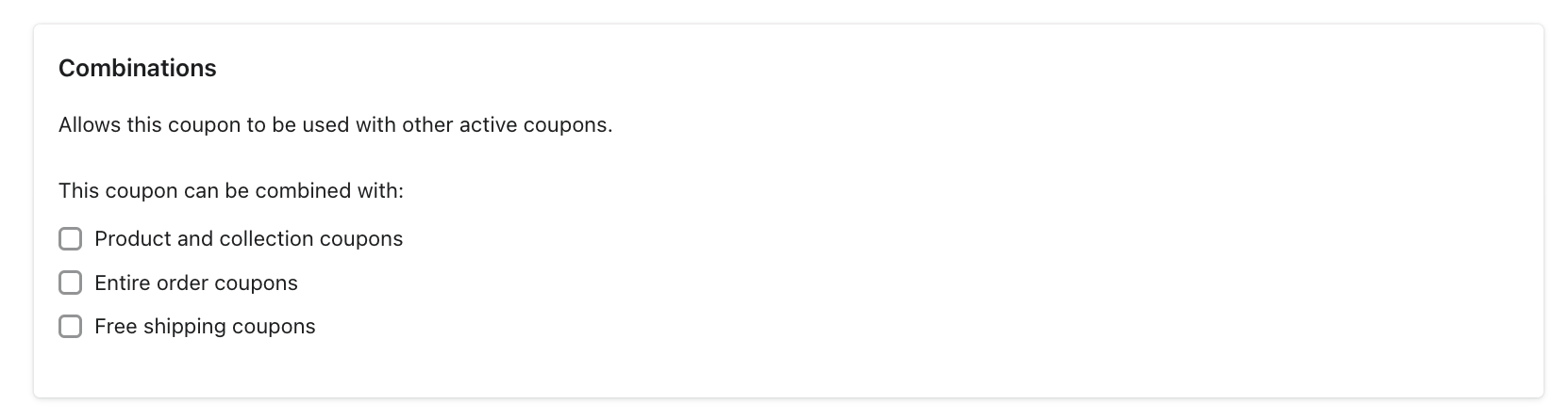 It's also important to note that if you update coupon settings, such as discount type and percentage, within Shopify, all codes generated with those price settings will have the new price settings. If you update coupon settings in Shopify that are not available in Klaviyo's coupon creation, those changes will not be reflected. See information on updating coupon codes for more details.