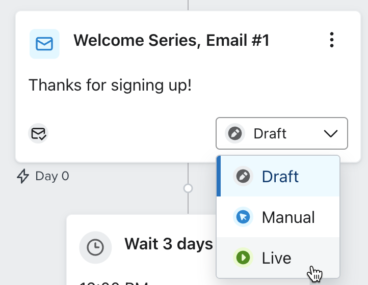 - To send the message automatically moving forward, set it to Live status by clicking on the status dropdown for the message in the flow builder.