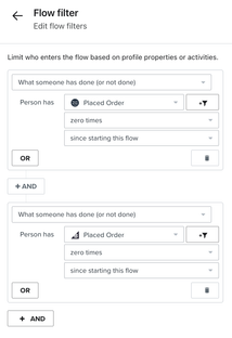 For Buy with Prime, this flow is triggered by the Checkout Started event, which is tracked when a customer clicks Proceed to checkout on their Buy with Prime cart and authenticates with Amazon. This flow also has a time delay, and it filters out everyone who has purchased from your site, either using Buy with Prime (via the Buy with Prime Placed Order event) or directly in your site’s checkout page (via your ecommerce platform’s Placed Order event).