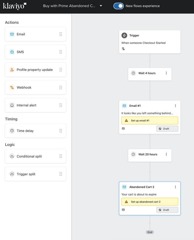 Learn how to create an abandoned cart flow to send reminders to your Buy with Prime customers. Flows, also known as automations or drip campaigns, are Klaviyo’s tools for personalized communications with your customers. An abandoned cart flow is a message or sequence of messages sent to someone who added an item to their shopping cart, but failed to complete the purchase.