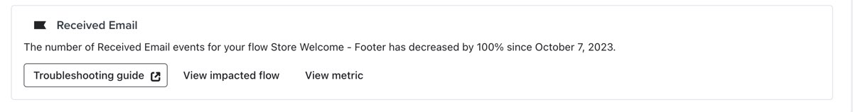 Klaviyo will alert you if your flow has a drop in volume of message received events compared to historical data for your account. This includes rates for the following message types: